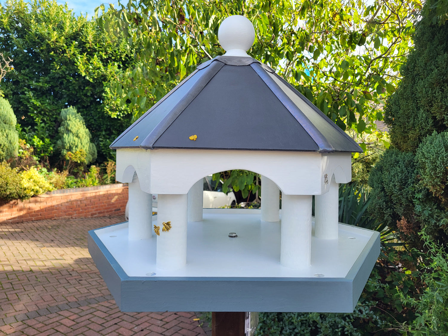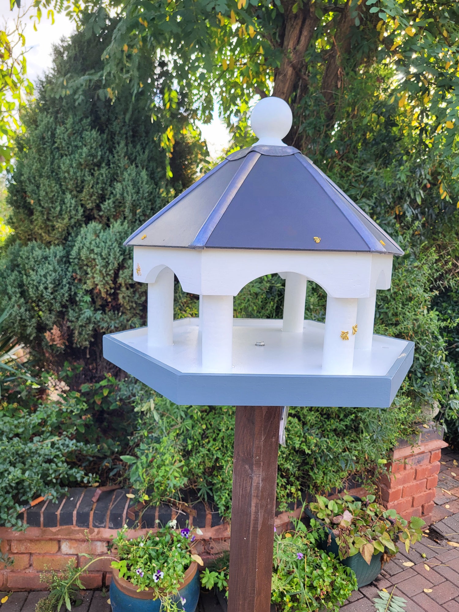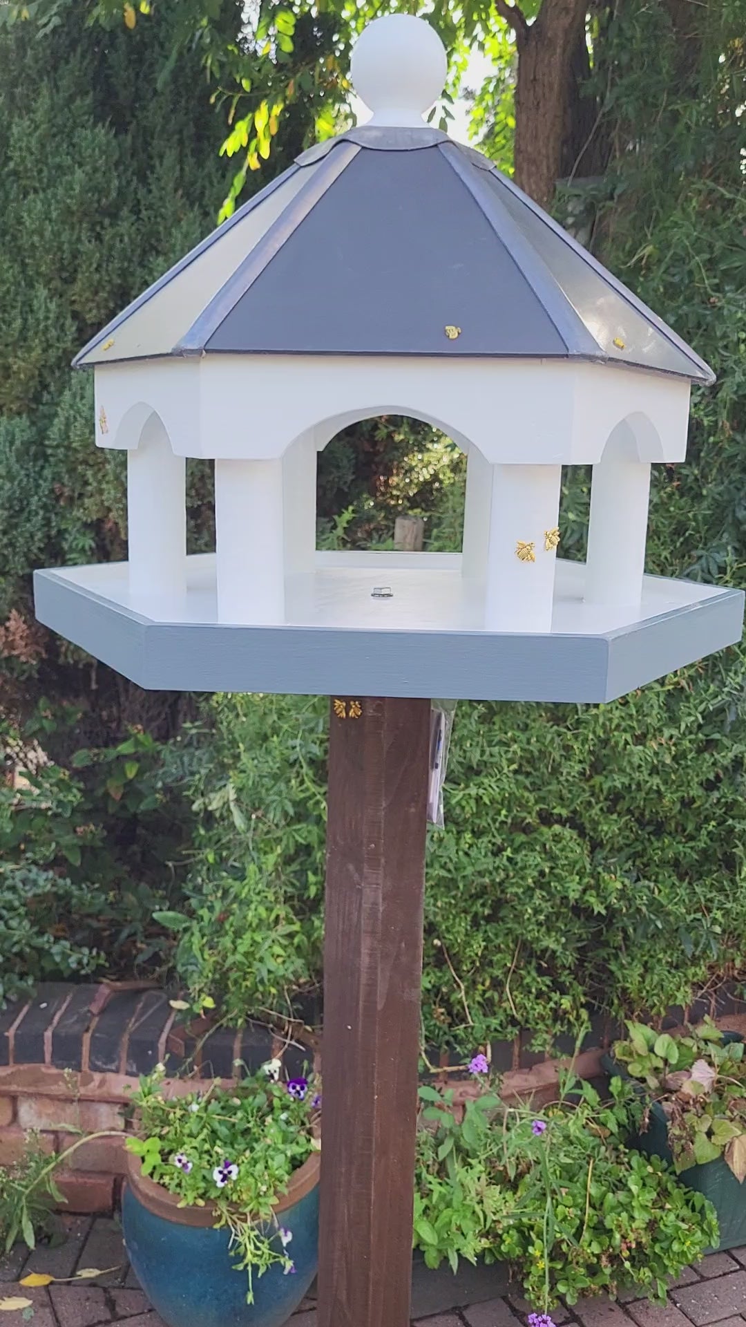 The Castle design has a roof finished in Slate and Lead with continuous edging and rain drains in the table. All Humbirds Bird tables feature Bee, Ladybirds and other motifs around the table which gives nice aesthetics with functionality.